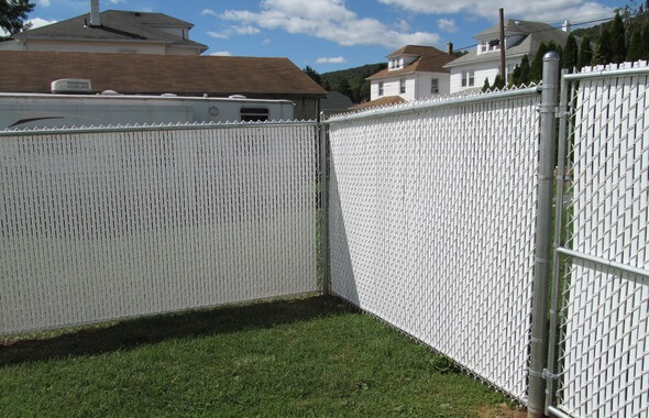 The fence looks like this. Chain link with white privacy slats. Our fence isn’t as new but the slats are all intact. You get the idea.