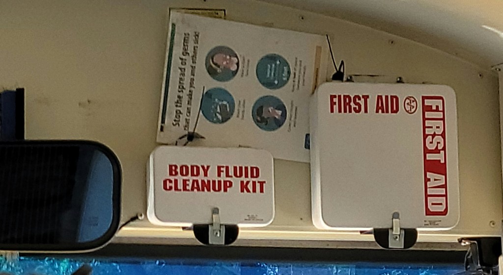 Sad that a shuttle bus has to carry a body fluid cleanup kit, but it is a good idea anyway.