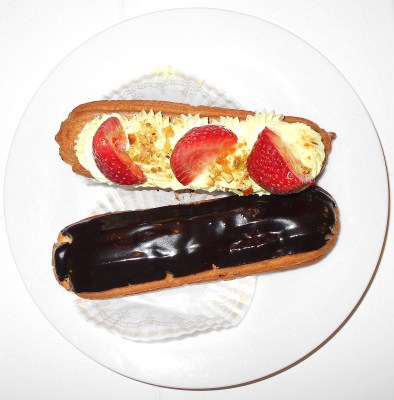 “Puzzled Girl” opted for the strawberry topped one which is pistachio with strawberry filling – real strawberries – topped with fresh organic strawberries and pistachios. I went with the chocolate covered traditional eclair.
